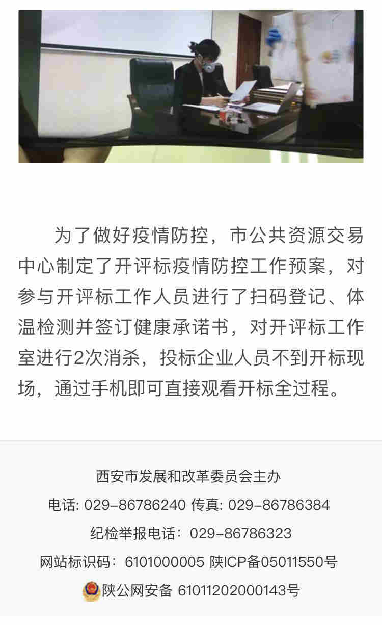 自抗擊疫情阻擊戰打響以來,我公司積極響應國家發改委《關于積極應對疫情創新做好招投標工作保障經濟平穩運行的通知》(發改電《2020》170號)、財政部《關于疫情防控期間開展政府采購活動有關事項的通知》(財辦庫《2020》29號)、市公共交易中心《疫情防控期間政府采購項目“不見面”開標工作辦法》等有關通知。公司全員一致高度重視,并在各級政府的關心和大力支持下,我司積極探索、主動承擔起了西安市首例電子化“不見面”開標模式,為了確保本次招標項目順利進行,我司領導與招標人、監管部門及市公共資源交易中心進行了深入的探討和溝通,并進行了多次模擬演練,于2020年2月25日上午在西安市公共資源交易中心順利實施了全過程電子化“不見面,在線視頻直播”的方式,對《臨潼渭北工業區標準工業廠房設計施工總承包》工程項目進行了公開招標(后附西安新聞網及發改委等有關官方報道)。